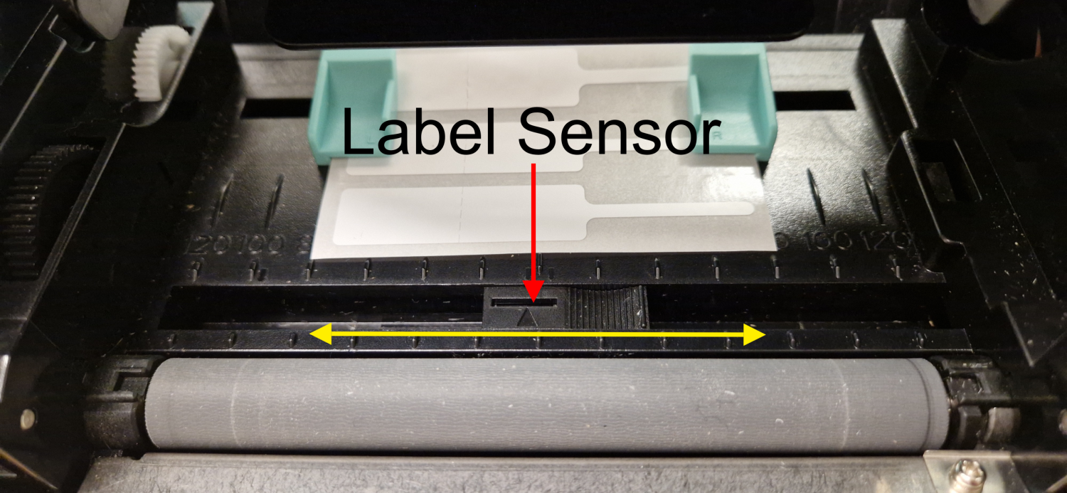 The gap sensor may be in the incorrect position – the gap sensor is found in the label shoot near the label guides. This can slide from side to side and, if you are using labels with gaps between them, should be positioned in the centre of the label. If your labels have black marks on the liner that indicates where labels end, the sensor should be shifted to the side that the black mark is on. The black mark MUST pass over the sensor.