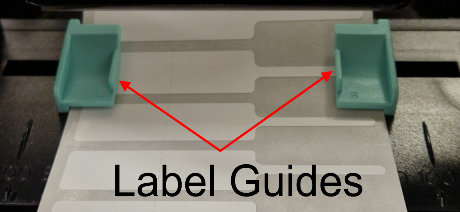 Next check that your labels are seated correctly and that they are facing UP. When checking that your labels are seated correctly, ensure your labels are under the label guides and that the guides are snug against the label liner (the backing) but not clamping it. There should be minimal side-to-side movement but no drag.
